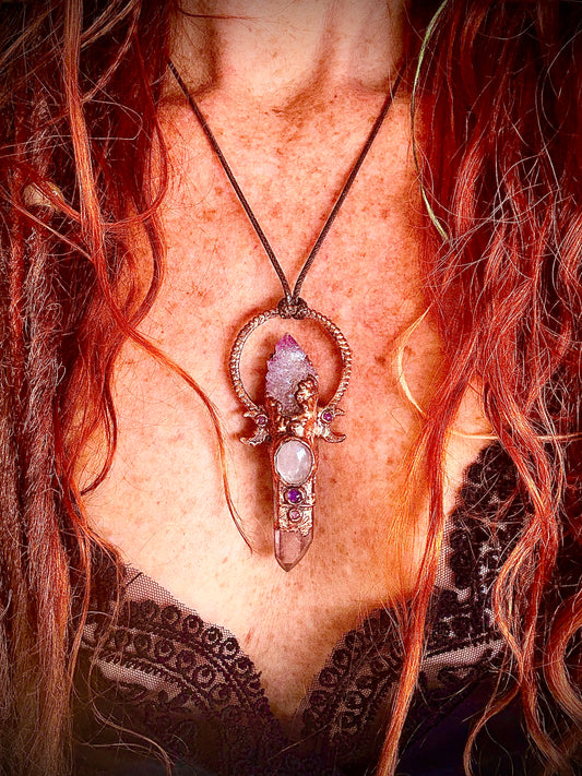 Spirit Quartz & Red Lithium Quartz Pendant with Moons