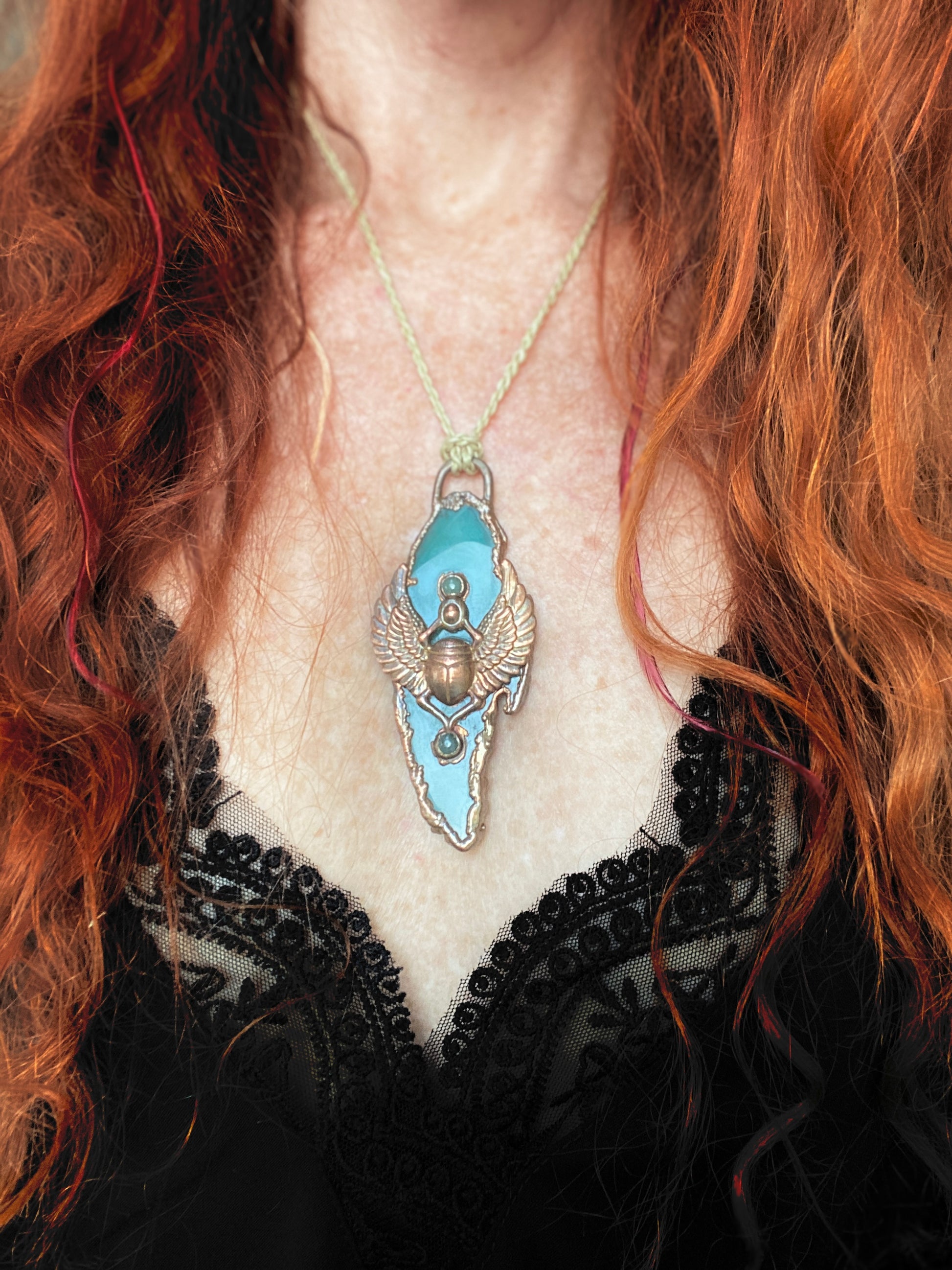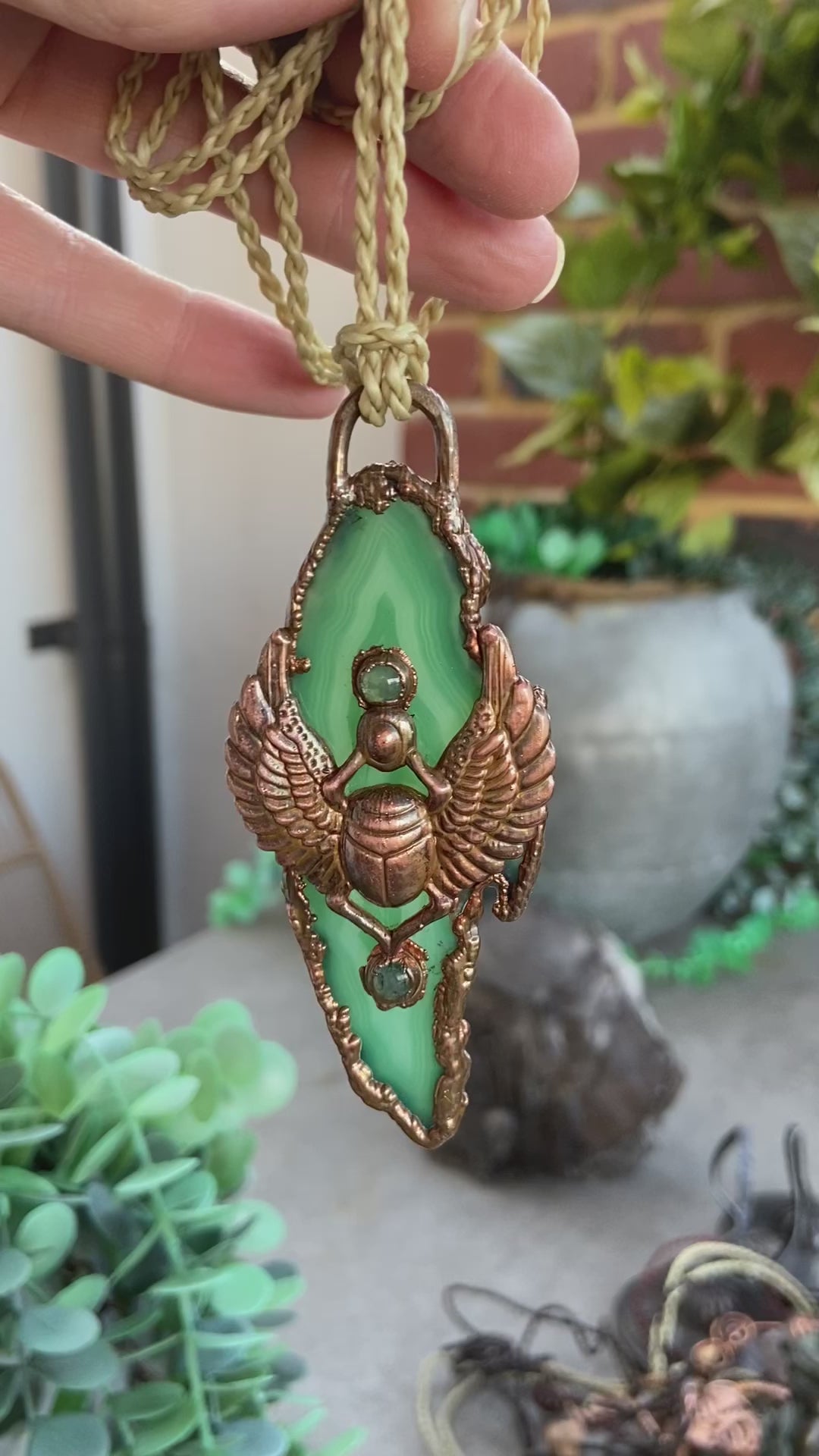 This handmade Green Agate Scarab Pendant blends the sacred symbolism of the scarab beetle with the grounding and protective energy of agate. In Egyptian mythology, the scarab beetle represented rebirth, transformation, and renewal. The Egyptian Sun God Khepri, often depicted with a scarab face, symbolized the rising sun and the cycle of life.