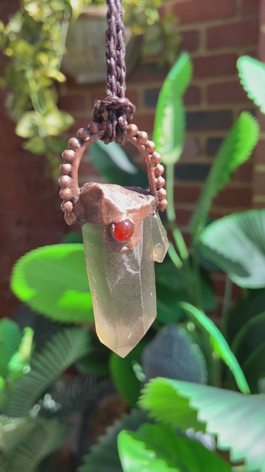 This handmade Smoky Quartz and Carnelian Copper Pendant is a stunning statement piece, featuring a twin raw smoky quartz crystal set in copper, accented by a vibrant carnelian. Designed for those who love unique crystal jewellery, this pendant is both eye-catching and rich in healing energy.