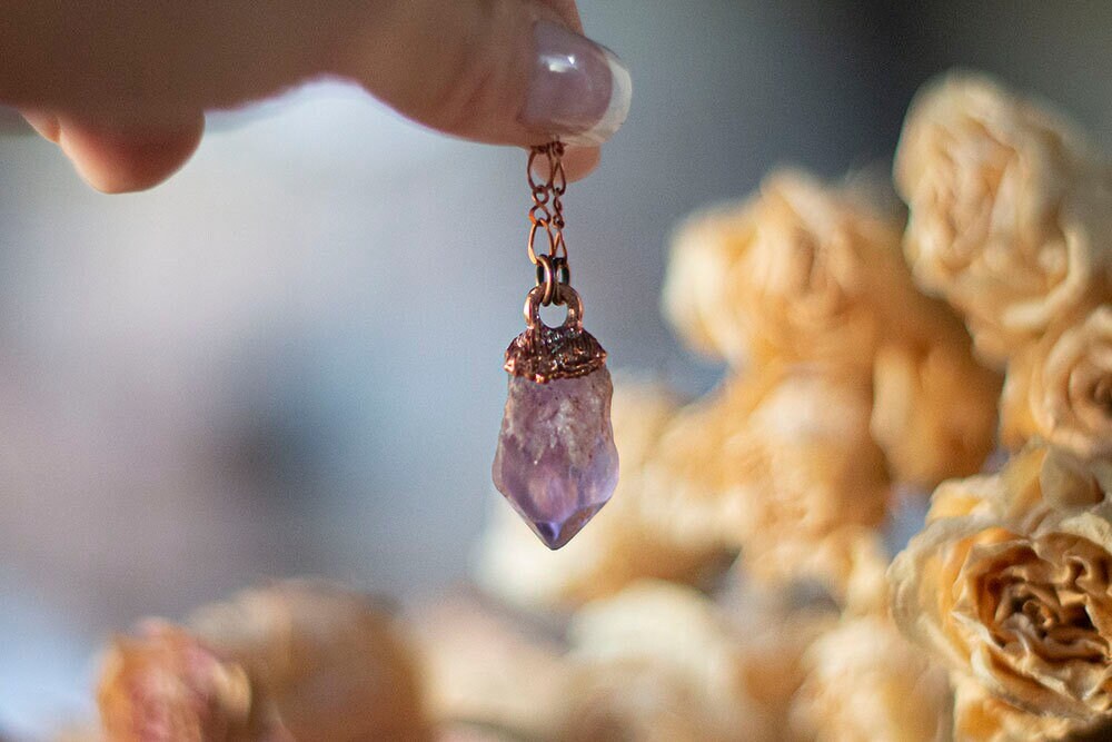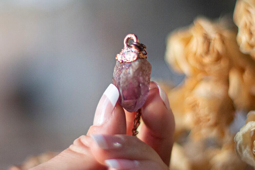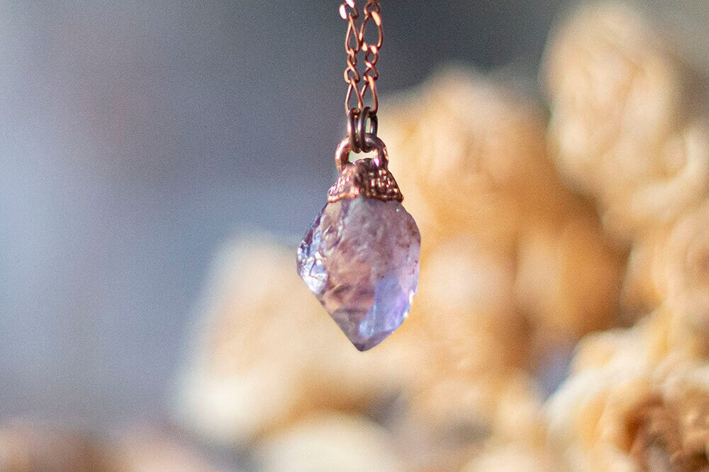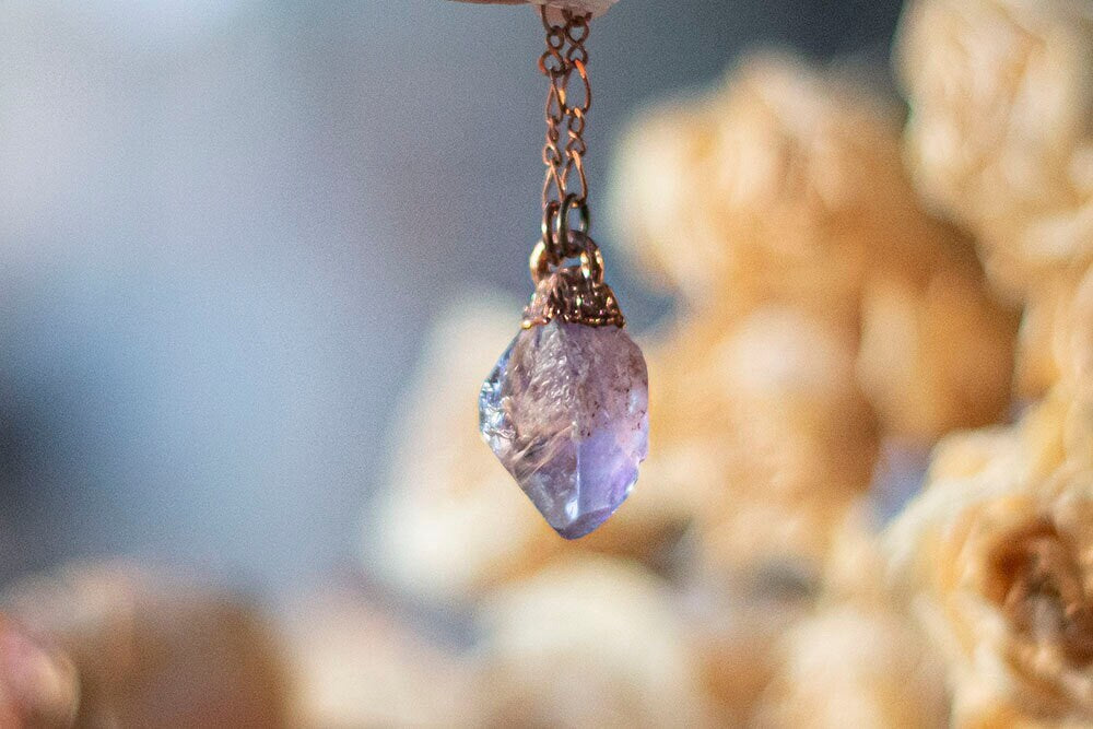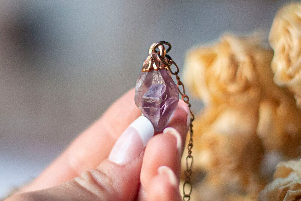 This handmade raw amethyst pendant is a delicate yet powerful piece, perfect for those who love boho crystal jewellery. Made from raw amethyst and set in electroformed copper, it carries both spiritual energy and artisanal charm.