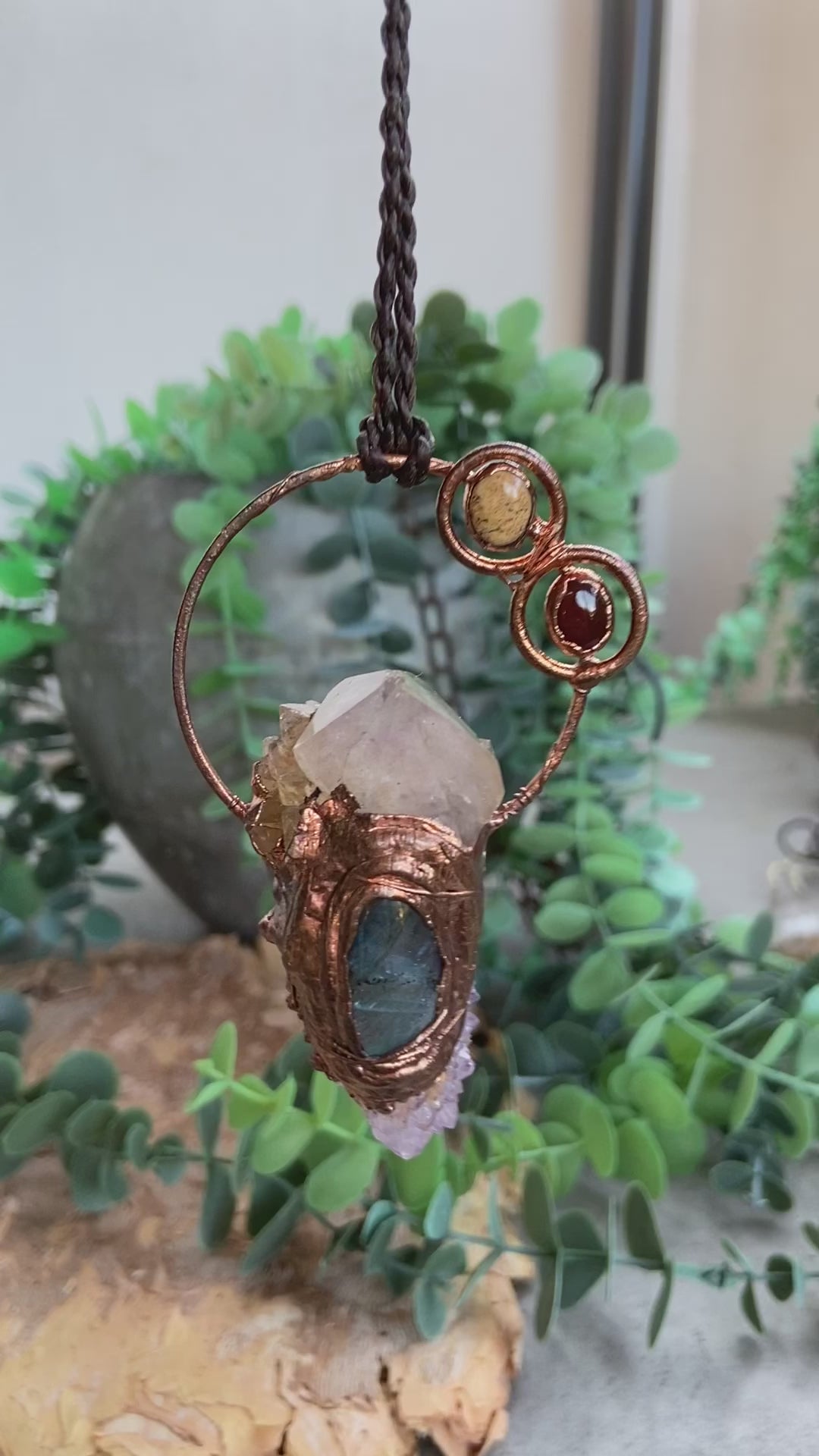 This gorgeous, unique pendant is going to turns heads and make you feel special whenever you wear it. Created with Smoky Quartz, Amethyst Spirit Quartz with a hint of Citrine, an amazing blue-fire Labradorite and a touch of jasper and carnelian.