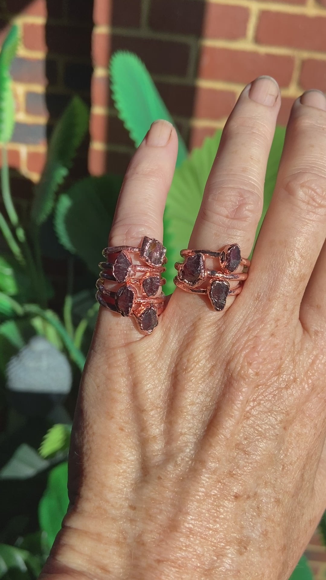 Elevate your jewellery collection with this handcrafted raw garnet copper stacker ring, designed for those who love boho, crystal, and electroformed copper jewellery. Whether worn solo as a statement piece or stacked with others, this unique crystal ring blends raw elegance with grounding energy.