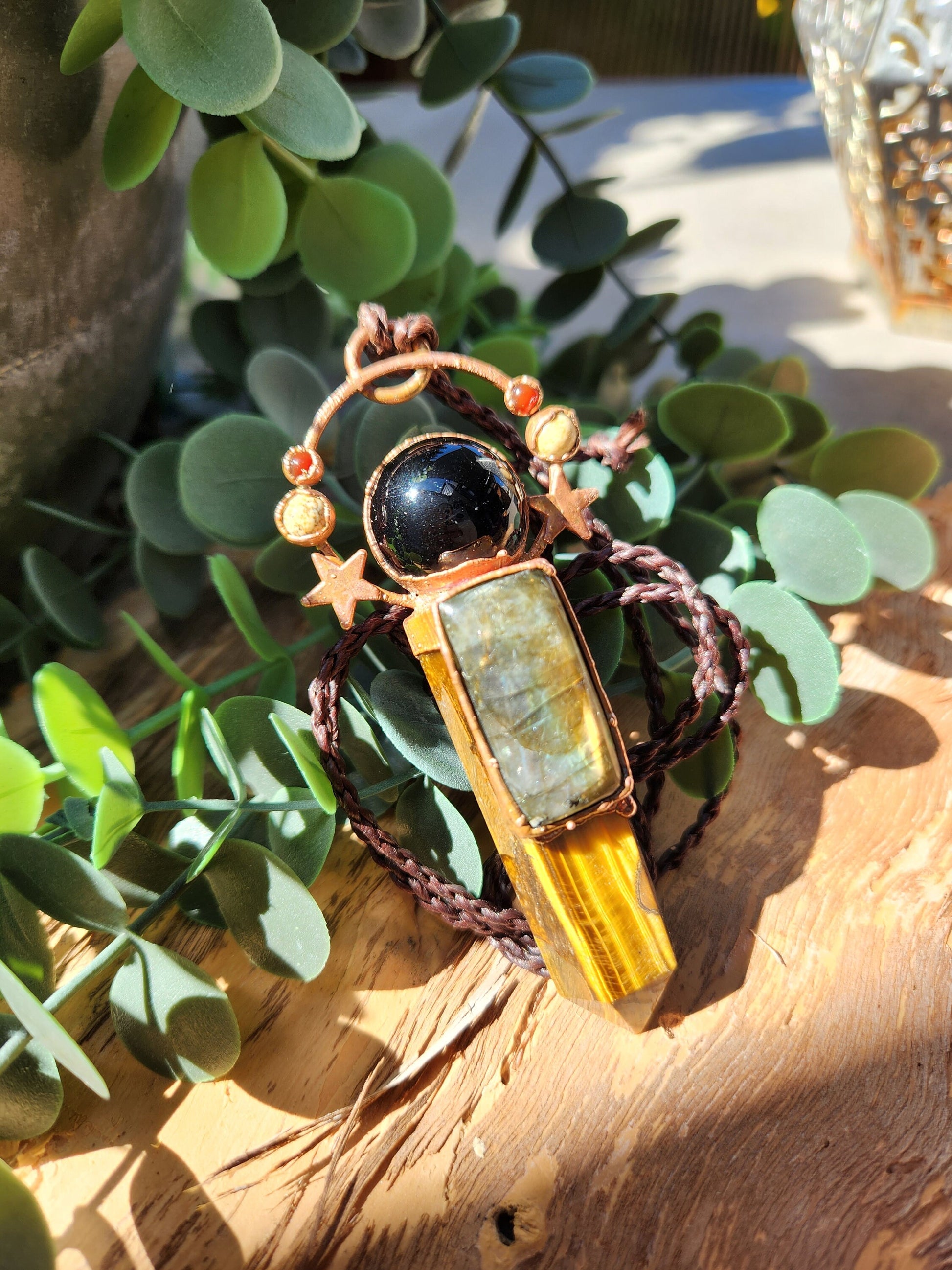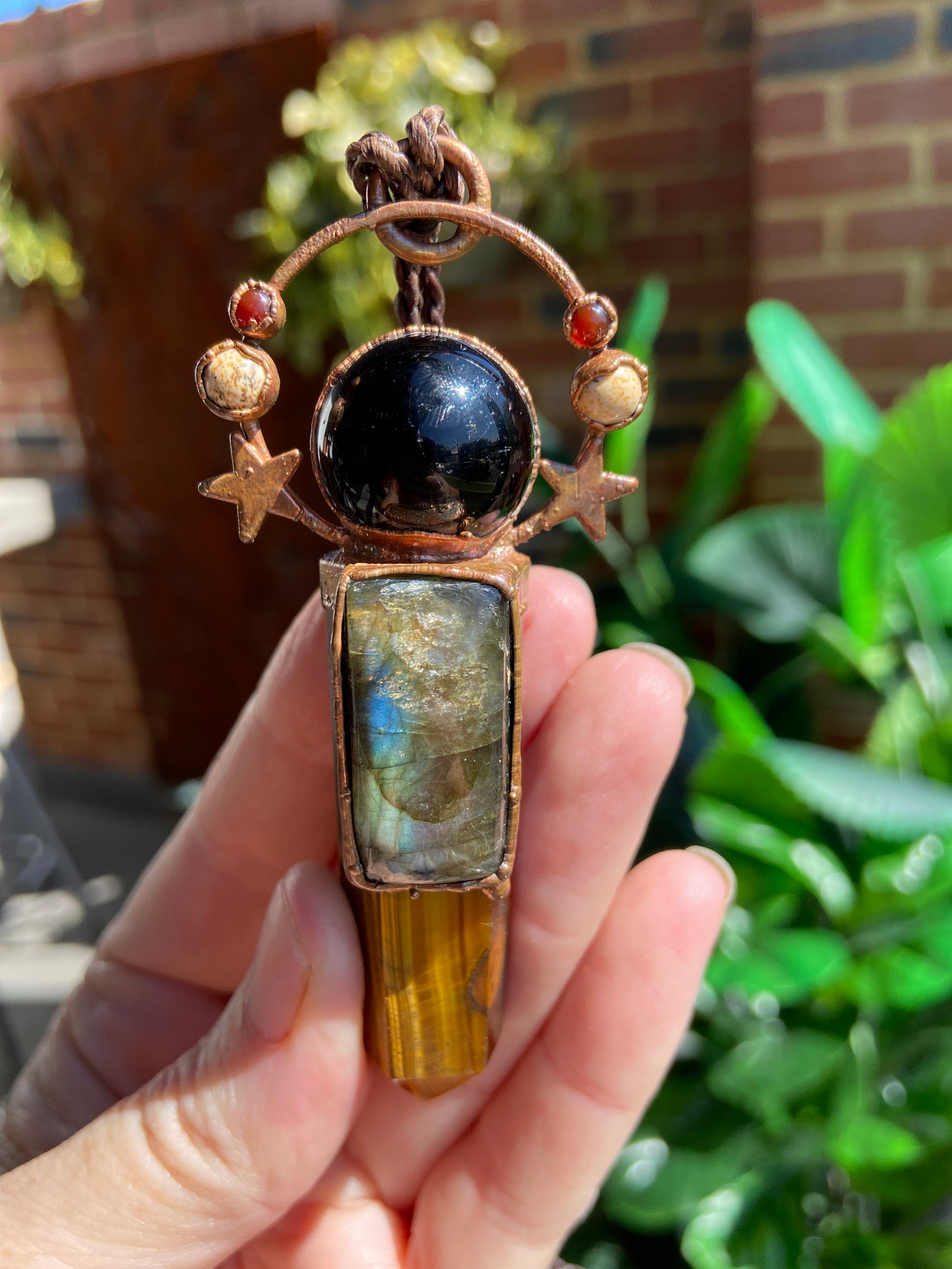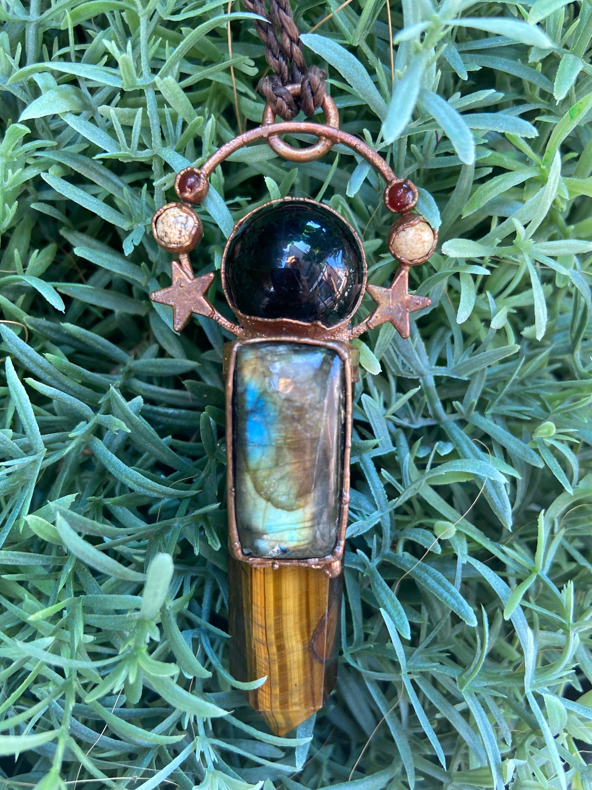 Stardust Goddess Pendant - Tiger's Eye Point with Labradorite, Obsidian, Yellow Jasper, Carnelian and Copper