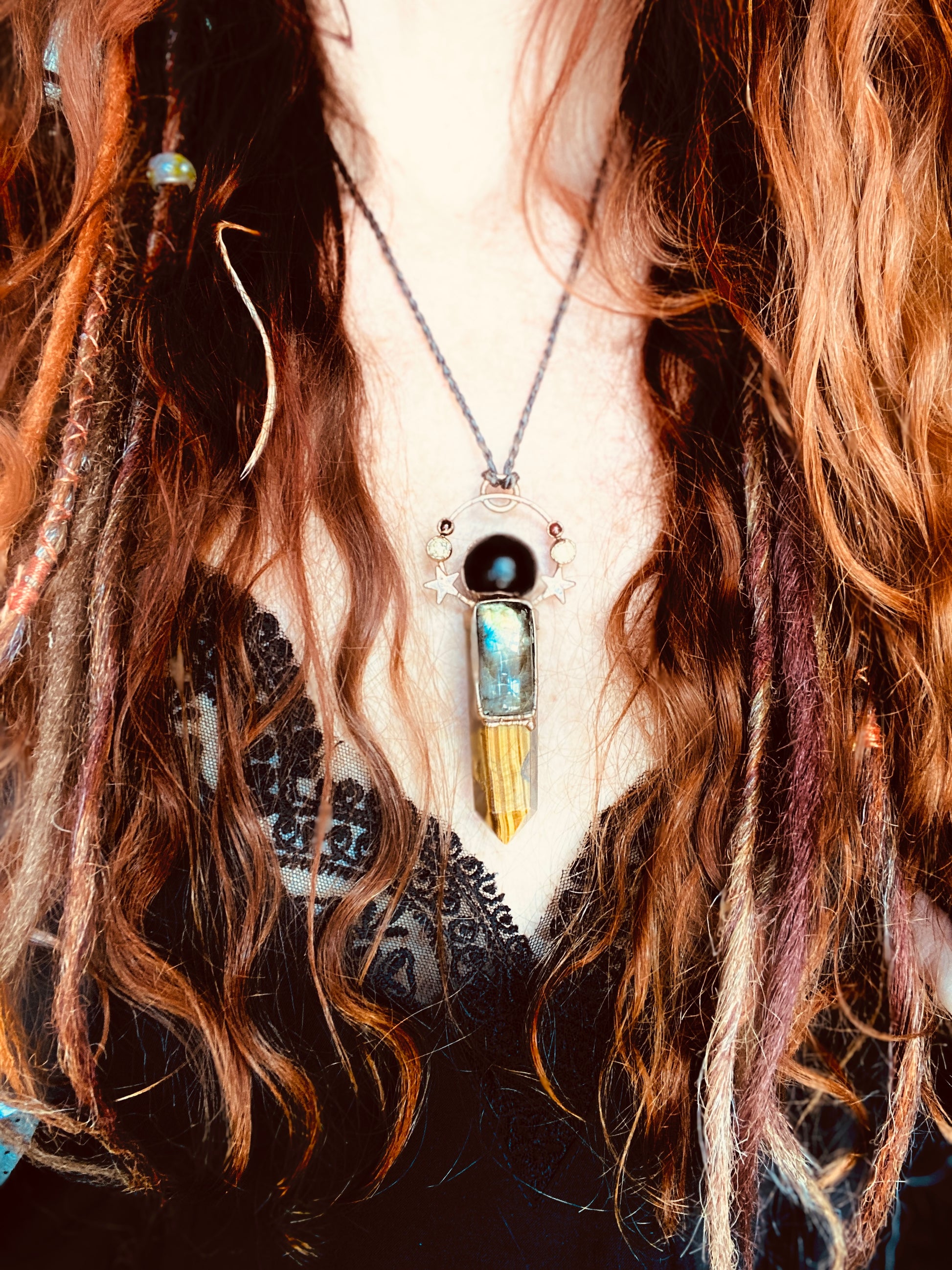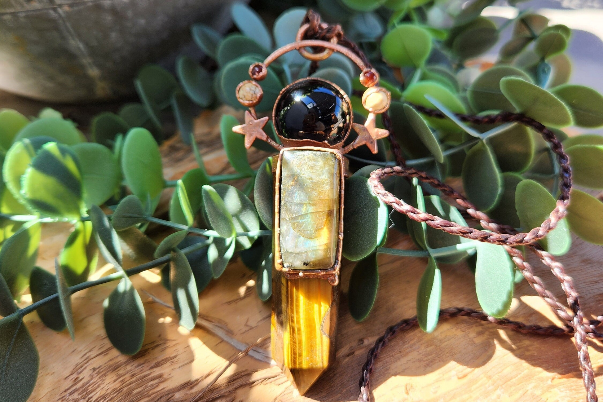The Stardust Goddess Necklace is created with Tigers Eye Point, Fire Labradorite, Black Obsidian Sphere, Yellow Jasper, Carnelian and copper. This would make a perfect gift for anyone interested in crystals, spirituality, and healing.