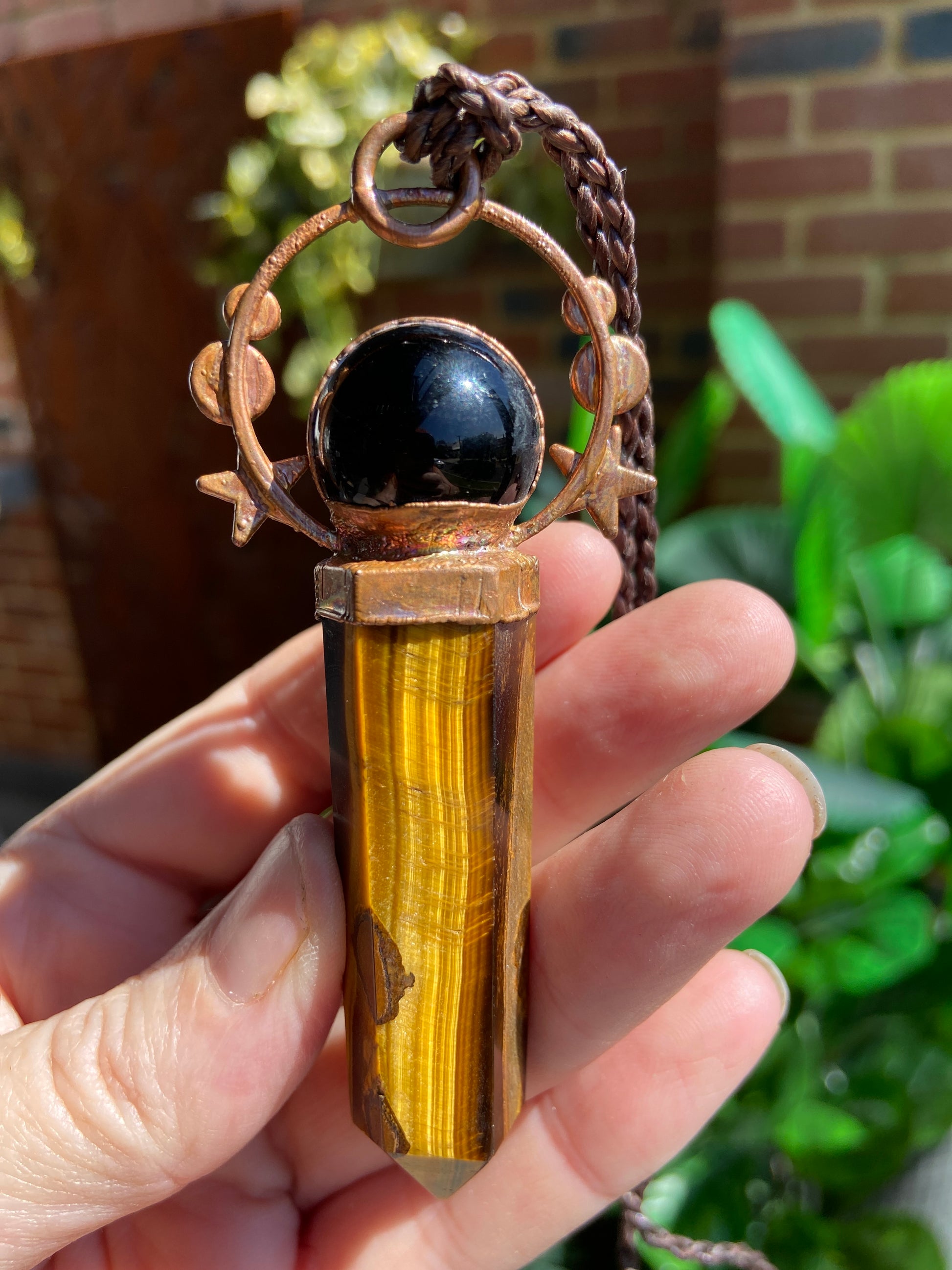 Tiger's Eye is powerful stone that aids in releasing fear and anxiety, promoting mental clarity, and grounding the energies of the sun and earth. In this special pendant Tiger's Eye has been teamed with Labradorite for protection against negative energies and psychic attacks, and Obsidian to absorb and transmute negative energies. This combination makes for a powerful talisman, aiding in protection against negative energy.
