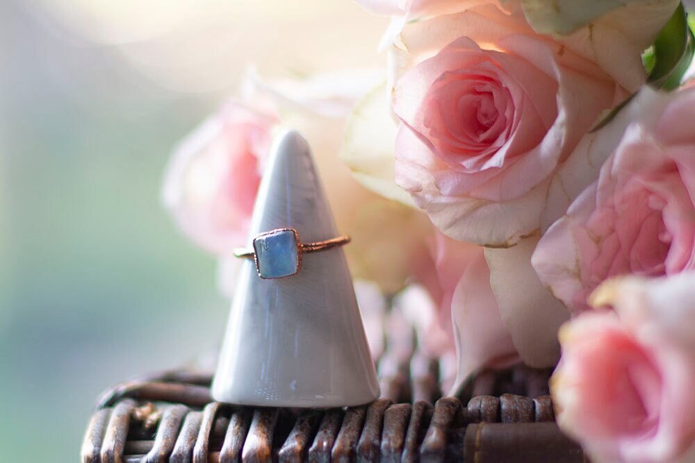 This dainty, stackable aquamarine copper ring is a perfect March birthday gift, offering a soothing, oceanic energy. With its smooth, tumbled finish, this ring has a polished, refined look, making it ideal for both casual wear and dressy occasions—it looks especially stunning with denim!