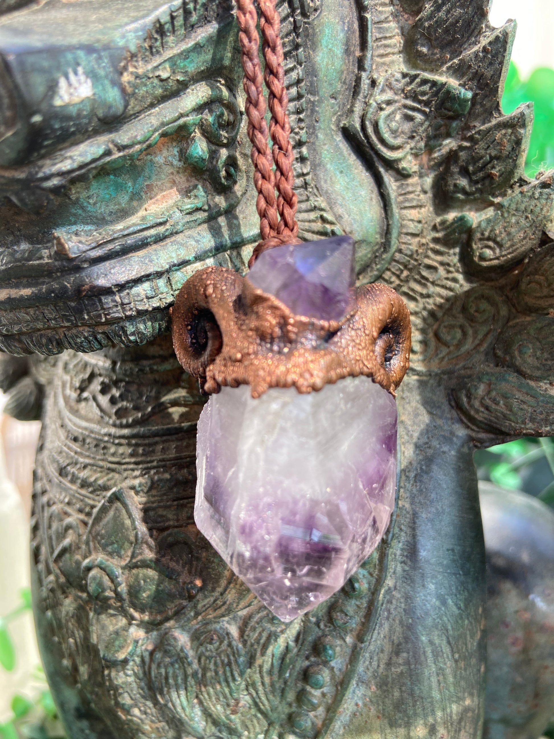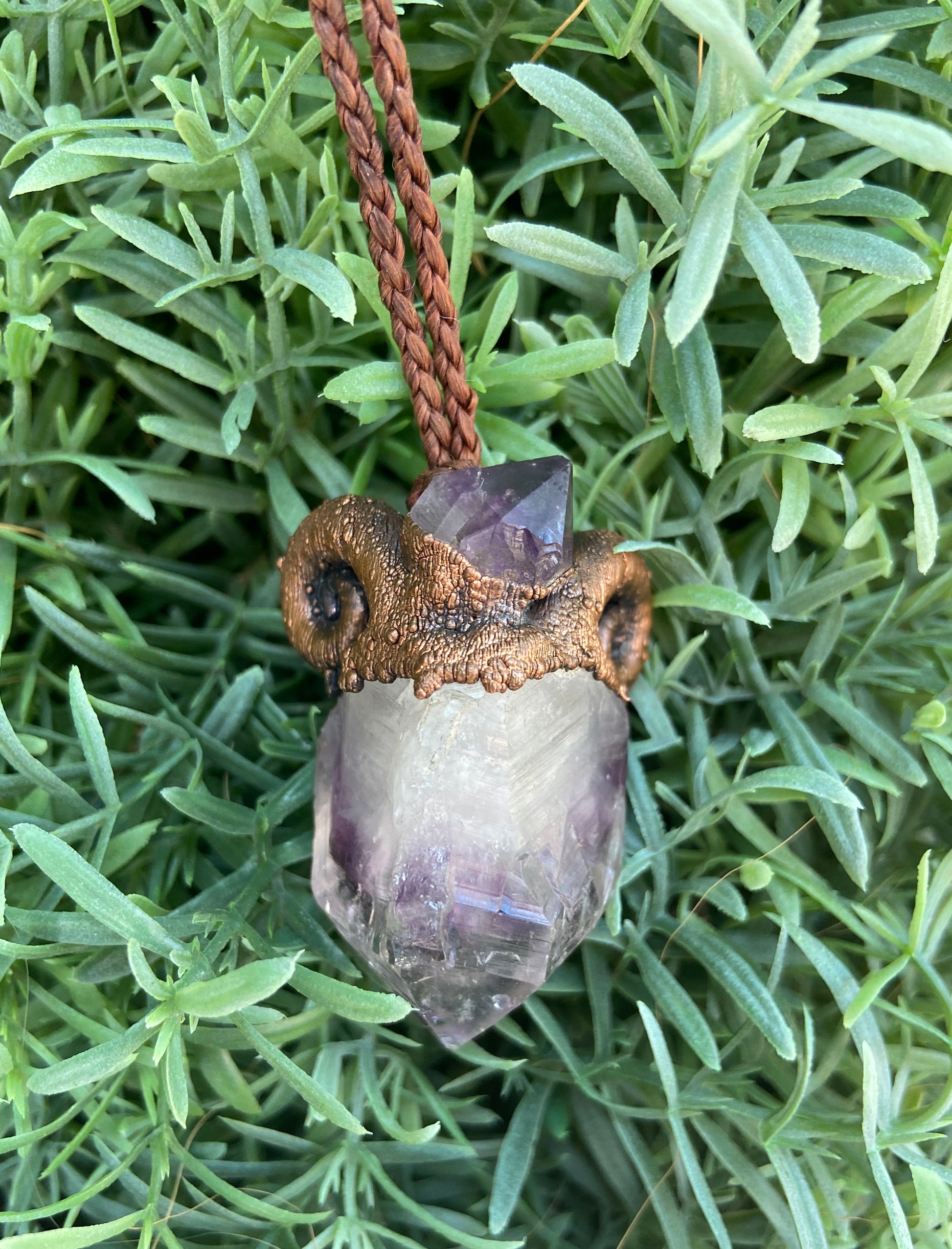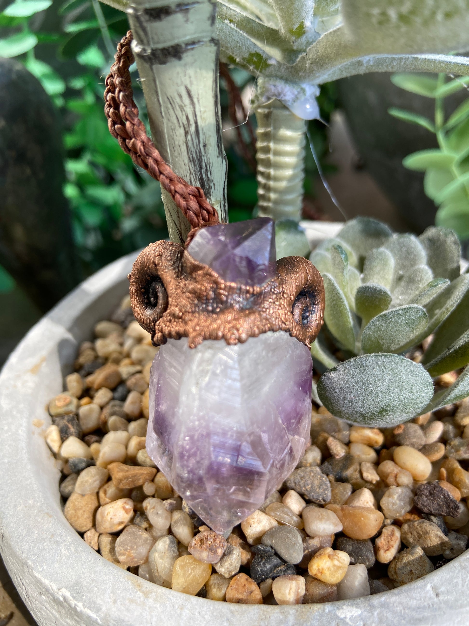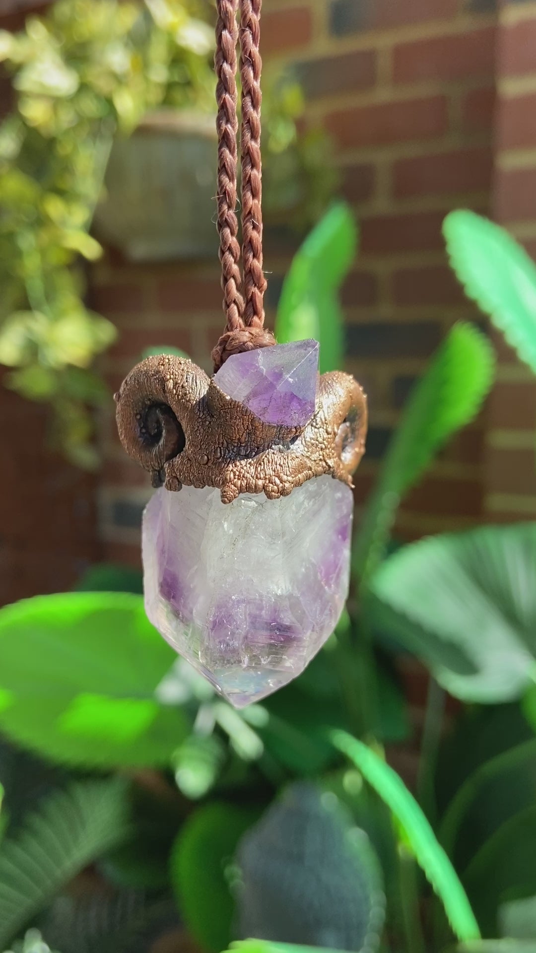 This handmade zodiac Capricorn pendant features two raw amethyst points, making it a meaningful and powerful gift for those born under the Capricorn star sign. Crafted with electroformed copper, this medium statement pendant embodies the strength, wisdom, and resilience of Capricorn energy.