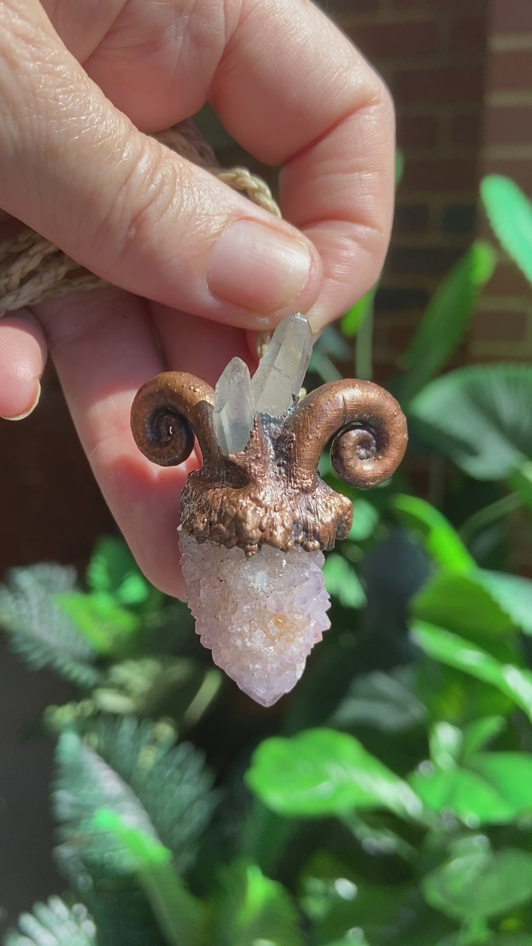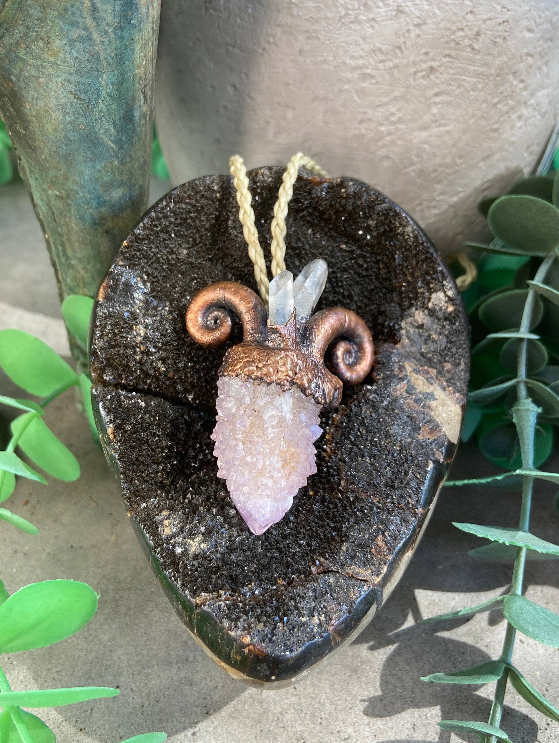 This handmade zodiac Clear Quartz and Spirit Quartz Pendant would make a perfect gift for those born in the star sign of Capricorn. The spirit quartz is a combination of amethyst and citrine which makes for a beautiful healing combination. It is stopped with two raw clear quartz crsutals and is created with electroformed copper.